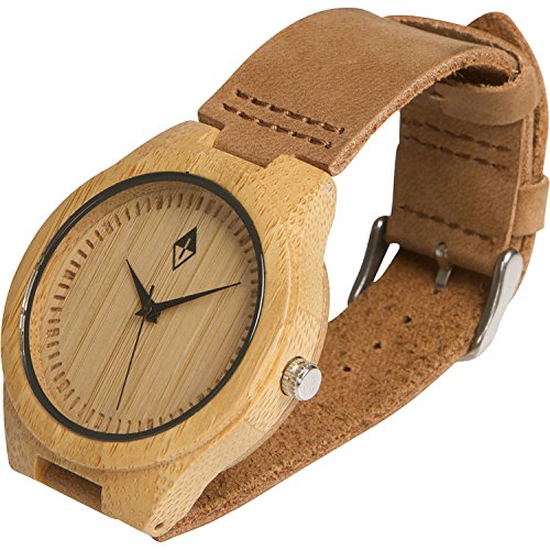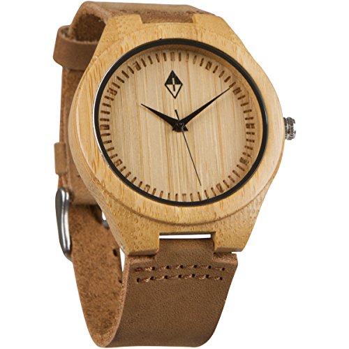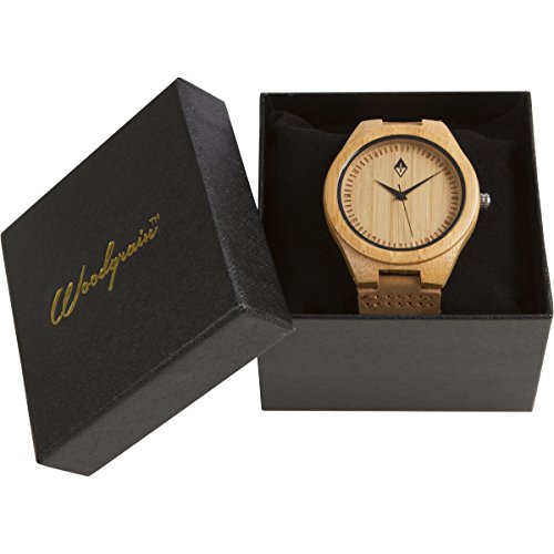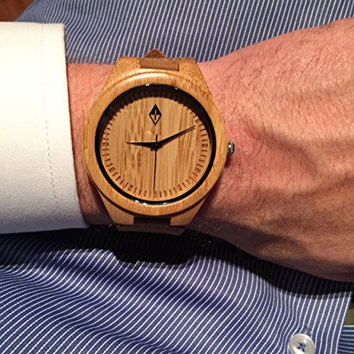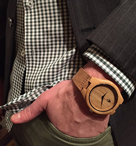 Men's wooden watches by Woodgrain Watches. 100% Natural Bamboo Wooden Wrist Watch. Wood grain watches handmade by a professional watchmaker with genuine leather band and Quartz Analog movement. Every wood watch comes in an exclusive black gift box.