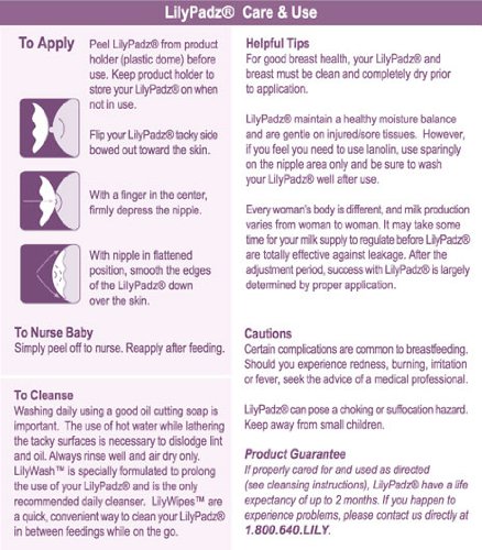 -. Feature : Comfortable, Discreet underneath clothing / Prevents leaking rather than absorbing, Keeping clothes dry / Sleep Braless, Go Strapless, Go Swimming / Best Nursing Pads, 100% Medical Grade Silicone / Includes 2 pairs Regular size LilyPadz, LilyWash and LilyWipe