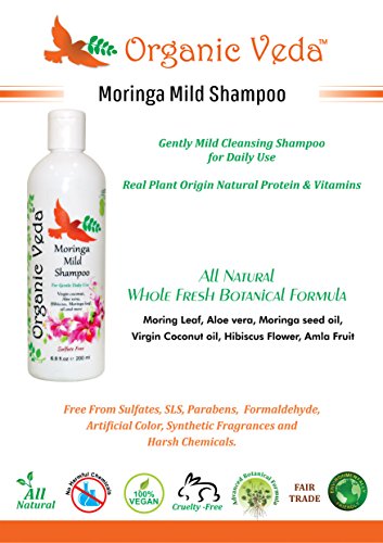 - Title : Organic Veda - Moringa Mild Shampoo - 200 ml. ★ Plant Based Natural Vitamins and Minerals. ★ Mild and Daily Care. ★ Advanced Herbal Formula. ★ Aloe Vera. ★ Virgin Coconut. ★ Hibiscus. ★ Moringa Leaf Oil. ★ Natural and Chemical Free.