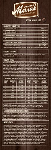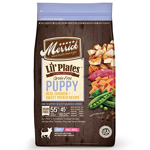 -. Binding : Misc. -. Brand : Merrick -. EAN : 0022808260073 -. Feature : Grain free; no corn, wheat, soy or gluten -.Real deboned chicken is the first ingredient -.Cooked in America with the Earth's Best Ingredients -.No ingredients from China -. Label : Merrick Pet Care -. Manufacturer : Merrick Pet Care -. Model : 26007 -. MPN : 26007 -. NumberOfItems : 1 -. PackageQuantity : 1 -. PartNumber : 26007 -. ProductGroup : Pet Products -. ProductTypeName : PET_SUPPLIES -. Publisher : Merrick Pet Care -. Size : 4 lb -. Studio : Merrick Pet Care -. Title : Merrick Lil'Plates Grain Free Puppy Real Chicken + Sweet Potato Dry Puppy Food, 4 LB -. UPC : 022808260073