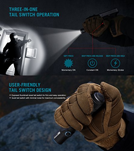Three-in-one tail switch operation: momentary-on turbo (soft press); constant ON/OFF (deep press); momentary strobe(deep press and hold). Exposed thumbnail sized tail switch for firm and easy operation. Quiet tail switch with minimal noise for maximum concealability.