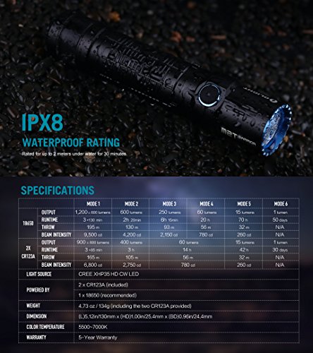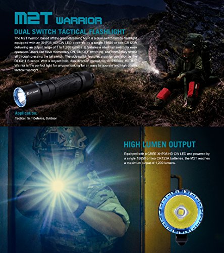 The Olight M2T Warrior, based off the groundbreaking M2R model is a dual switch LED tactical flashlight equipped with an XHP35 HD CW LED powered by a single 18650 or two CR123A delivering an output range of 1 to 1,200 lumens.