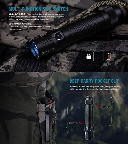 The side switch features a similar operation as the extremely popular OLIGHT S series flashlights for standard carry. With a lanyard hole, dual direction pocket clip, and holster, the M2T Warrior is the perfect light for anyone looking for an easy to operate and high quality tactical flashlight.