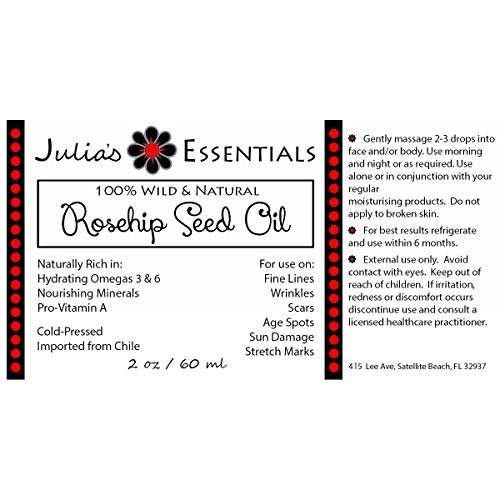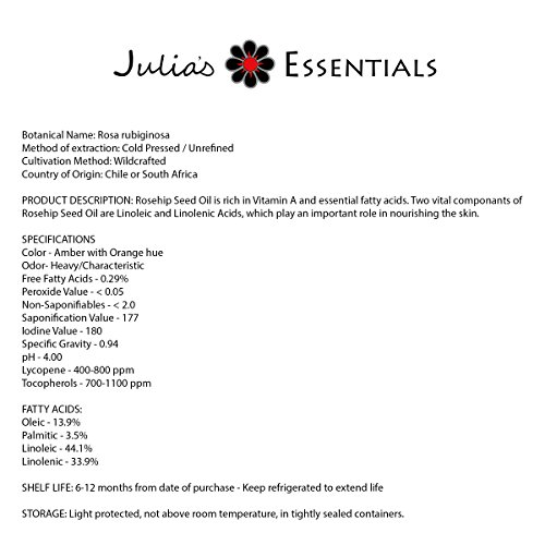 Julia's Essentials Rosehip Seed Oil moisturizes, nourishes and helps repair the skin. Julia's Essentials Rosehip Seed Oil is cold pressed to ensure the purest product available. With a minimum of 80% essential fatty acid, Rosehip Seed oil is rich in Omega 3 and Omega 6 which are vital nutrients for maintaining optimum skin health. Pro-Vitamin A also assists in skin cell renewal. Julia's Essentials Rosehip Seed Oil is easily absorbed and leaves no oily residue. It can be used on the face, body and hair. Skin Type: All skin types (some oily skin types may not benefit) Tried & tested: Independent clinical studies show that Rosehip Seed Oil significantly improves the appearance of scars, stretch marks and fine lines and wrinkles. 41% improvement in color of scars 43% improvement in visible area of stretch marks 44% improvement in skin moisture 23% improvement in fine lines and wrinkles.-- How To: Gently massage 2-3 drops into face and/or body. Use morning and night or as required. Use alone or in conjunction with your regular moisturizing products. Do not apply to broken skin. Not included in Julia's Essentials Rosehip Seed Oil: No synthetic fragrances or colors No genetically modified ingredients, No petroleum derived products, No silicone oils and derivatives, No animal testing ._________________________________________________________________________________________________________ Please Note: Rosehip Seed oil does not smell of roses (it is not an essential oil but a "fixed" or "carrier" oil), Rosehip Seed oil has a kind of "nutty", "earthy" organic smell. It is also a "dry" feeling oil with a yellow to red hue, depending on the time of year it is harvested. Best if used within 6 months and stored in the refrigerator. Guaranteed FRESH!Feature