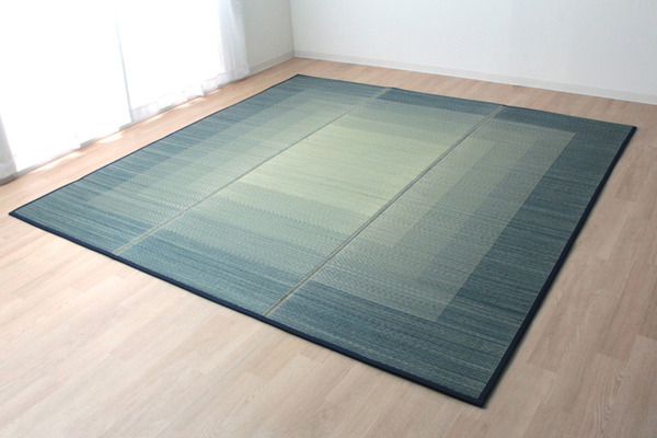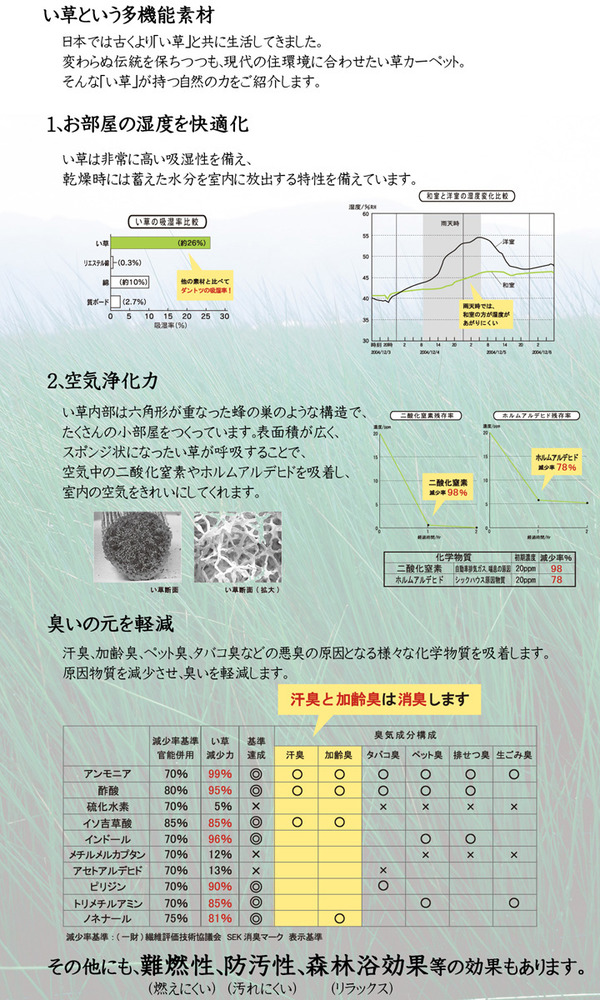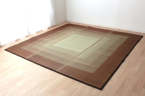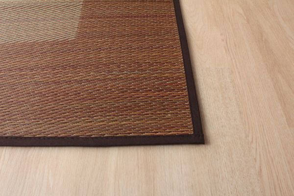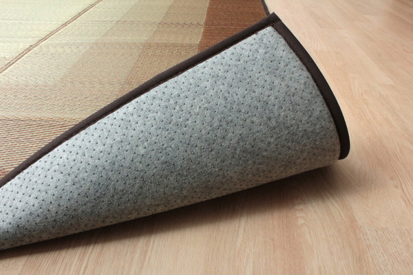 通常商品シンプルなデザインに仕上げたイ草ラグカーペットです。中材にはクッション性にこだわり、ウレタン8mmを使用しています。クッション性、耐圧分散性に優れたウレタンをイ草と不織布でサンドしました。プニプニとして柔らかく、フローリングのお部屋に最適な商品です。フローリングを傷つけないよう、裏には不織布を貼っています。裏にはすべりにくい加工も施しています。い草には空気の自然浄化作用、湿度の調節作用などがあり、汚れにくいという特長があります。い草に青森ヒバ加工を施しています(抗菌・防臭効果)。青森県のヒバの木から抽出した「ヒバ油」をメーカー独自の技術で材料や商品に加工しました。「ヒバ油」には、ヒノキチオールという天然物質としては極めて抗菌性の高い成分が含まれ、医療や食品など多分野で利用研究が進められています。※自然素材であること、また職人が一つ一つ手作業にて加工を行うため、形状のバラつきや表示サイズと多少異なることがあります。ご了承下さい。