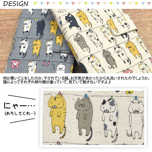 猫好きなら気に入ること間違いなし!!いっぱいの猫達が干されている柄の手帳型ケースです。 ちょっとしょんぼりしている感じがして、見ていて飽きないかわいいケースです。 衝撃やキズなどからiPhoneを守るのはもちろん、カメラ、イヤホンや各種ボタンなどを ケースに入れたまま操作可能です。 内部はソフトケースなので着脱が簡単! 横開きタイプなので、手帳のように使うことができます。 内側にはカードポケットとサイドポケットが付いています。 また、ストラップとストラップホール付きです。 カラーはベージュとグレーの2色からお選びいただけます。 ※デザイン、色味は画像と異なる場合がございます。 ※iPhoneは付属しません。 ※ライセンス商品ではありません。 |