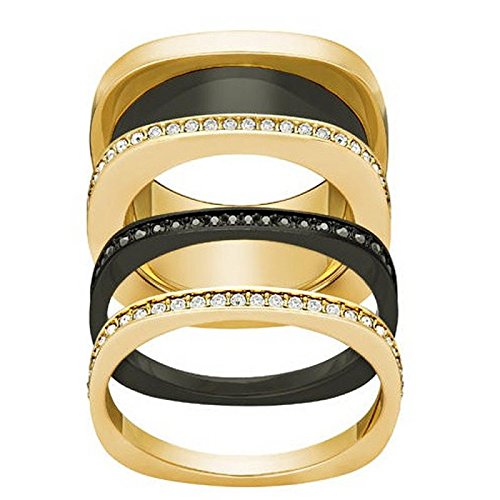 -. Feature : Swarovski Rings / This versatile gold-plated Swarovski ring offers many different looks in one. / Gold-Plated Stainless Steel Rings / The three inner rings (two in gold-plated metal and one in black PVD metal) are decorated with sparkling black and clear crystal pav�. / Featuring an innovative screw mechanism, they can be worn separately or together with the main ring.