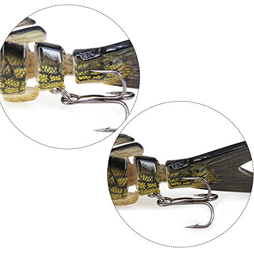 -. Feature : ABS fishing body, black nickel treble hooks with rust proof and textile fabrics throughout the joint sections on the bait contribute long time service / Size: 5.1"/ 13cm; weight: 0.7oz/ 29g; / Rigged with 2 quality treble hooks, size: #6; High durability and flexibility hinge. / Smooth and rapid diving action. Life-like swimming actions in water to provoke predator to bite. / Versatile fishing: Specially for pike, muskie, and snakehead fishing, also available to other fish. Rust-free feature makes it make it ideal for sea fishing, and fit for freshwater as well