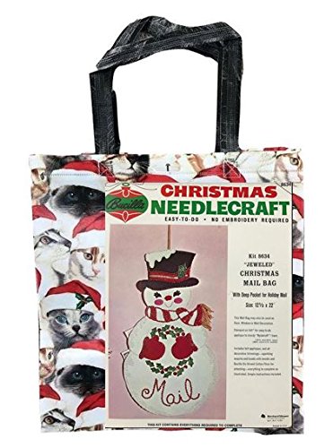 Vintage Bucilla Christmas Needlecraft Kit & Cats in Santa Hats Tote Bag Bundle - Jeweled Snowman Mail Bag with Deep Pocket for Holiday Cards - 12.5 x 22 Inches
