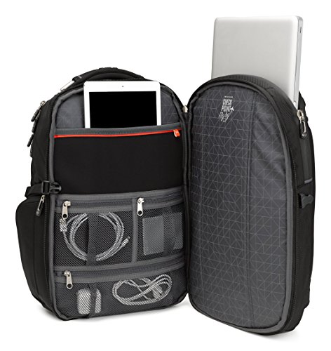 Zippered mesh pockets inside TSA compartment for tech accessory storage. Fully padded rear laptop compartment. Molded front pockets and side pocket adds protection for valuables