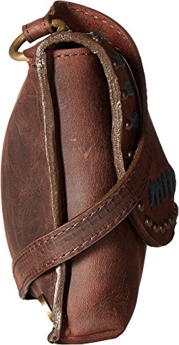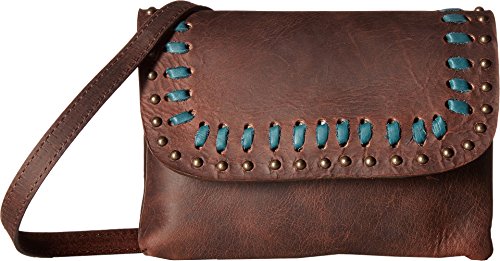 Leather crossbody with contrast leather whipstitching and brass metal studs.
