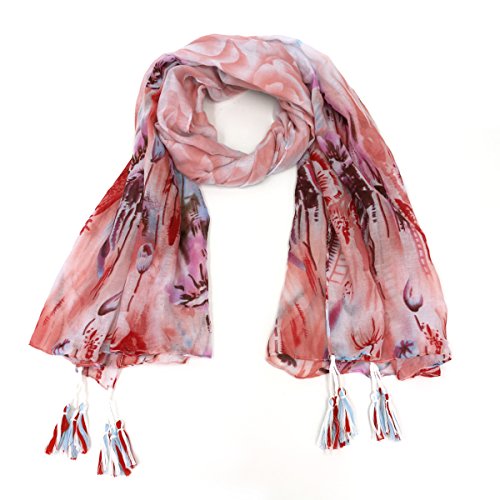 Binding : Apparel Product Description This pink scarf with floral accents and tassels is the perfect accessory to any outfit - winter or summer alike. Style a variety of ways, including around the neck or as a head scarf. Women's scarves are a great way to dress up your look for work or even a night out. 0