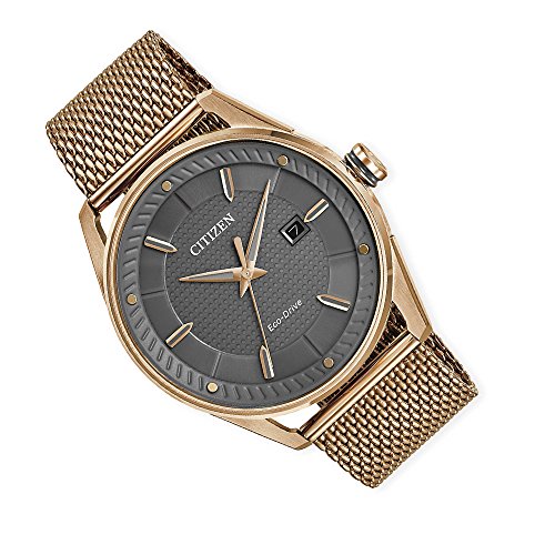 Completing the design is a rose gold-tone stainless steel Milanese bracelet that comfortably secures the watch to your wrist.42mm rose gold-tone stainless steel caseMineral CrystalJapanese Quartz movementTextured, grey dial with rose gold-tone hands and indicesDate window100 meter water resistanceRose gold-tone stainless steel braceletCitizen Drive Style#: BM6983-51H