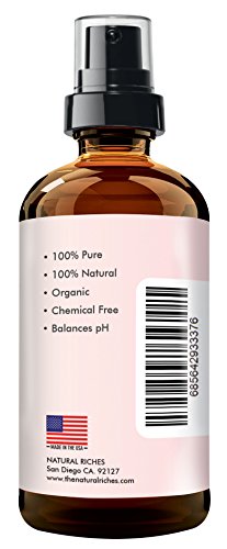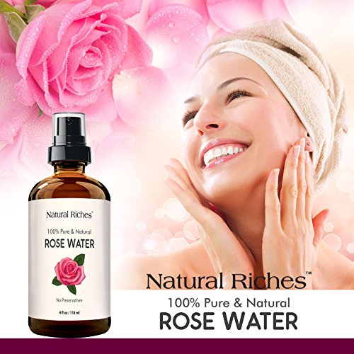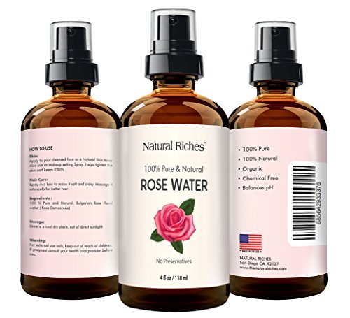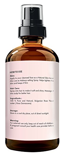 -. Feature : 100% PURE ROSE WATER ORGANIC FACIAL TONER : Is a rejuvenating face toner and cleanser with an uplifting floral scent. Works well with Acne. Restores and balances pH of the skin. Rosewater anti-inflammatory properties help reduce redness and skin irritation caused by sun damage. The high-quality mist spray refreshes and uplifts your mood. Rose water is a daily beauty treatment for your skin to keep your skin looking young and healthy. / NATURAL RICHES BULGARIAN ROSE WATER: Daily beauty treatment for your skin. 100% Pure and natural, A Skin toner with calming aroma. Spray on as a natural mist for calming irritated red skin. Apply a few drops to a cotton ball and smooth over skin after cleansing. / CONDITIONS AND ADDS SHINE TO DULL HAIR: Rosewater contains natural antioxidants which help remove pollutants and boost hair health. Spray on your hair to tone and brighten. It repairs damaged hair and promotes hair growth / NO ALCOHOL OR HARMFUL CHEMICALS: Rosewater contains antibacterial properties and is excellent for skin treatment. Nature's own toner. It will help naturally tone your skin, close open pores, and soften your skin with a healthy glow. It revitalizes the Skin and keeps wrinkles and lines at bay. Spray rose water on your makeup as a makeup setting spray. / 100 % MONEY BACK GUARANTEE: Our Rosewater is the best in the market. We GUARANTEE it with a LIFETIME hassle-free money back guarantee.Just contact us and we'll refund you your order if you are not satisfied with the purchase. Try our Rosewater risk-free. Packaging contains a high-quality dark amber glass bottle, a spray nozzle, and a glass dropper for various rosewater DIY applications that you may need.