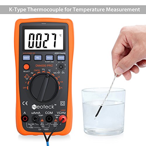 - 【Digital Multimeter with Temperature Test Function】 4000 Counts Multimeter Coming with a K-Type Thermocouple for Temperature Measurement up to 1000 Degree Celsius, Designed for Measuring AC/DC Voltage Current Resistance Capacitance Frequency Temperature