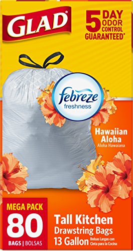 ReleaseDate : 2014-03-24 Studio : Glad Publisher : Glad Binding : Health and Beauty Product Description Glad OdorShield trash bags feature innovative reinforcing bands to help add strength while reducing plastic waste, while the OdorShield technology with Febreze Freshness leaves your home with a Hawaiian Aloha Scent. The strong, 3-layer drawstring closure makes garbage bags easy to lift, carry and toss away. For easy removal, pull the drawstring to enclose the trash, lift by the drawstrings and toss into garbage. Great for use in any room of the house where you need a strong bag and a fresh floral scent. 0