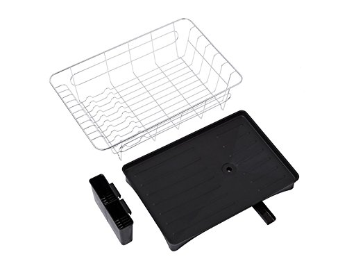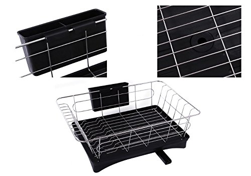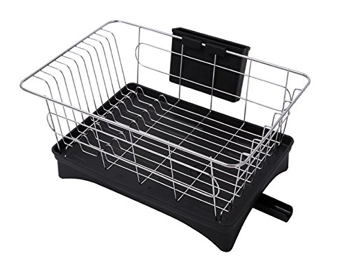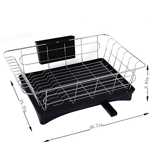 -. Brand : VuHom -. Color : Black -. EAN : 6165438027389 -. Feature : VuHom Holder holds dishes with side hooks to hang cups and glasses / Color coated wire base to protect dishes, and increase stylish / Swivel spout turns 360 degrees to direct excess water into the sink / Made of durable plastic and steel with rustproof bronze finish / Size:16.7x11.2x5.9-Inch -. ProductGroup : Kitchen -. ProductTypeName : KITCHEN -. Title : VuHom 16.7x11.2x5.9-Inch Kitchen Dish Drainer Rack with Tray And Swivel Spout Black