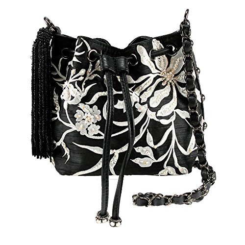 -. Brand : Mary Frances -. Color : Black/White -. Department : womens -. EAN : 0634010451516 -. Feature : Black and white embroidered mini handbag / Drawstring closure / Chain woven cross-body strap -. Model : MINI 451 -. ProductGroup : Shoes -. ProductTypeName : HANDBAG -. Title : Mary Frances Paris Anyone Mini Handbag -. UPC : 634010451516 Black drawstring mini bag elegantly embroidered with a white floral pattern, beaded tassel and chain wrapped cross-body strap.