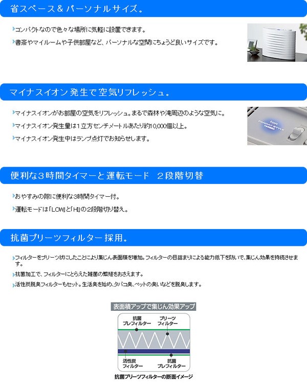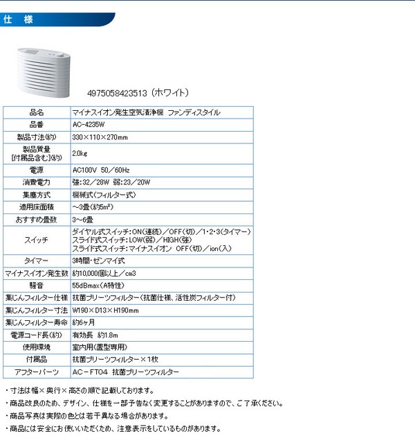 【商品名】 TWINBIRD(ツインバード) マイナスイオン発生空気清浄機 ファンディスタイル AC-4235W ホワイト 【ジャンル・特徴】 ハウスダスト、カビ、花粉、タバコ臭、ペット臭を素早く吸引 ●省スペース&パーソナルサイズ。コンパクトなので色々な場所に気軽に設置できます。書斎やマイルームや子供部屋など、パーソナルな空間にちょうど良いサイズです。●マイナスイオン発生で空気リフレッシュ。マイナスイオンがお部屋の空気をリフレッシュ。マイナスイオン発生量は1立方センチメートルあたり約10,000個以上。マイナスイオン発生中はランプ点灯でお知らせします。●便利な3時間タイマーと運転モード 2段階切替おやすみの際に便利な3時間タイマー付。運転モードは「LOW」と「HI」の2段階切り替え。●抗菌プリーツフィルター採用。フィルターをプリーツ状にしたことにより集じん表面積を増加。フィルターの目詰まりによる能力低下を防いで、集じん効果を持続させます。抗菌加工で、フィルターにとらえた雑菌の繁殖をおさえます。活性炭脱臭フィルターもセット。生活臭を始め、タバコ臭、ペットの臭いなどを脱臭します。■商