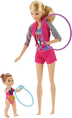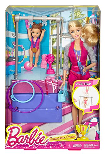 -. Binding : Toy -. Brand : Barbie -. Color : multi-color -. EAN : 0718645502215 -. Feature : Barbie doll comes with working gymnastic equipment and a student to play out gymnastic teacher career fun! / Snap the student doll's wrists into the clips on the bar and move the lever to watch her spin around with super stunts! / Use the ribbon that fits in dolls' hand to act out rhythmic dance / Hit the "mats" with the hoop / Award the "gold" medal or pink starred trophy for a perfect 10 -. IsAdultProduct : 0 -. ItemPartNumber : DKJ21 -. Label : Mattel -. Manufacturer : Mattel -. Model : DKJ21 -. MPN : DKJ21 -. PackageQuantity : 1 -. PartNumber : DKJ21 -. ProductGroup : Toy -. ProductTypeName : TOYS_AND_GAMES -. Publisher : Mattel -. Studio : Mattel -. Title : Barbie Gymnastic Dolls & Playset -. UPC : 743138526515 -. Warranty : 1 year warranty against manufacturer defects