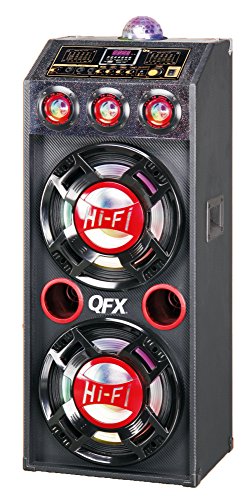-. Binding : Electronics -. Brand : QFX -. Color : Red -. EAN : 0606540026519 -. Feature : Professional Bluetooth cabinet speaker / NFC Bluetooth pairing, USB/SD playback, FM tuner and remote control / Built-in amplifier, Graphic equalizer, dual 12 inch woofers and three 1 inch tweeters / Speakers light up with RGB LED lights and disco dome light / Includes dual 1/4 inch microphone inputs and guitar input -. Label : QFX USA -. Manufacturer : QFX USA -. Model : SBX-412207BTRD -. MPN : SBX-412207BTRD -. PackageQuantity : 1 -. PartNumber : SBX-412207BTRD -. ProductGroup : CE -. ProductTypeName : PORTABLE_AUDIO -. Publisher : QFX USA -. Studio : QFX USA -. Title : QFX SBX-412207BTRD Bluetooth Speaker with Built-In Amplifier -. UPC : 606540026519