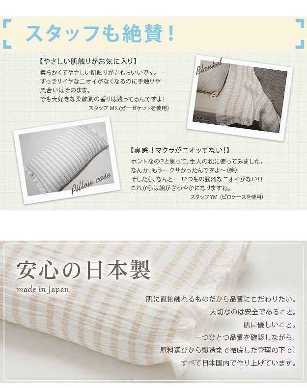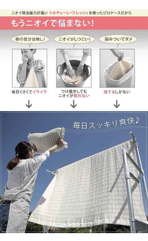 加齢臭も体臭もスッキリ消臭!消臭機能付きピロケース。着脱簡単な筒状タイプ☆伸び縮みするので枕の形にぴったりフィットします。消臭機能に優れた寝具でありながら、さらりとしたガーゼの柔らかな肌触りとナチュラルで優しい風合いが特徴。繊維そのものがニオイを中和する構造だから繰り返し洗濯しても消臭効果は持続します。ご家庭の洗濯機でお洗濯(水洗い・ネット使用)OK。