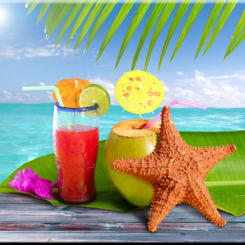 Rikki Knight RK-8intilec-1984 8" X 8" Coconuts Cocktails with Starfish on Blue Design Ceramic Art Tile