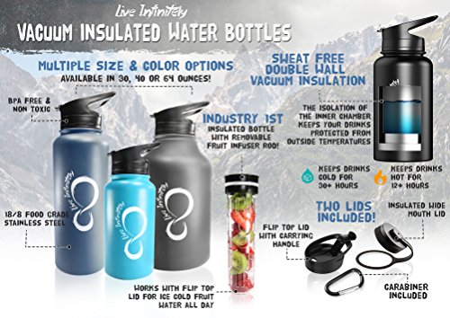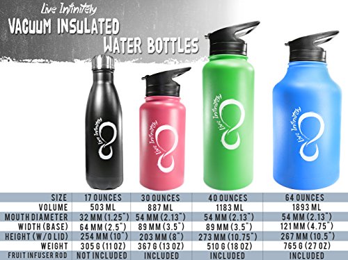 Choose Your Options Above - With 3 different sizes of 30oz, 40oz or 64 oz and over 10 vibrant color choices we have the bottle to fit just your taste! Every bottle is Live Infinitely backed with a 1 Year Unlimited Warranty.