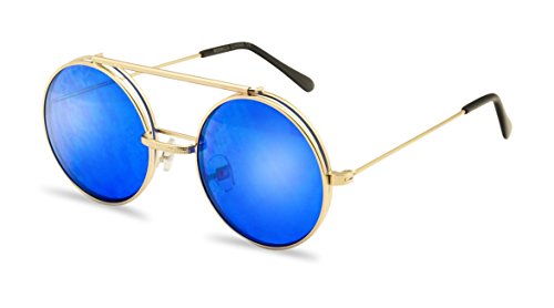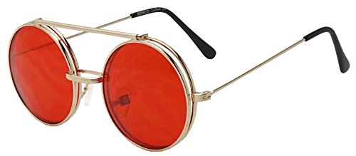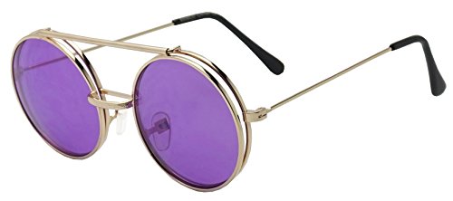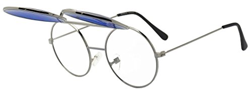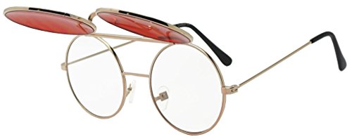 Product Description Be bold and step out of the usual in theses two in one flip-up shades. They are crafted with a thick brow bar, a stylish metal nose bridge; that projects in front of the frame, and fun retro flip-up color transparent lenses. These high fashion stylish sun shades are perfect for indoor and outdoor outings. No more need to take your stunning sunglasses off. With these you simply flip the cover lens up and continue to rock your fabulous look throughout your day. They are made with a thick metal based frame, classic metal hinges, and UV protected poly-carbonate lenses. 0