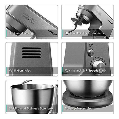 Comfee 2.6Qt Die Cast 7-in-1 Multi Function Tilt-Head Stand Mixer with SUS Mixing Bowl, Whisk, Hook, Beater, Splash Guard.4 Outlets, 7 Speeds & Pulse, 15 Minutes Timer Planetary Mixer