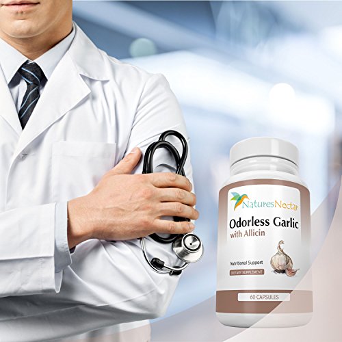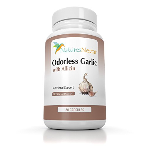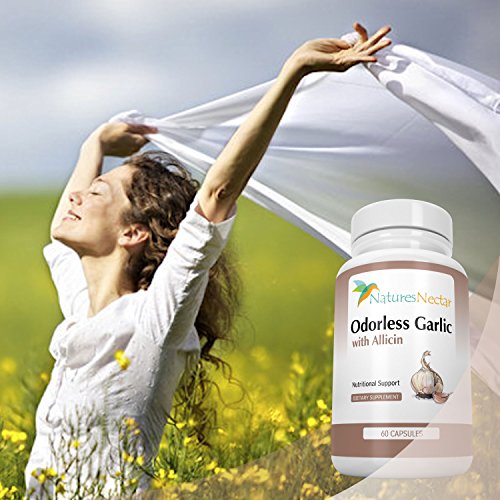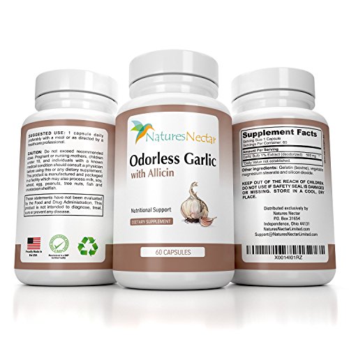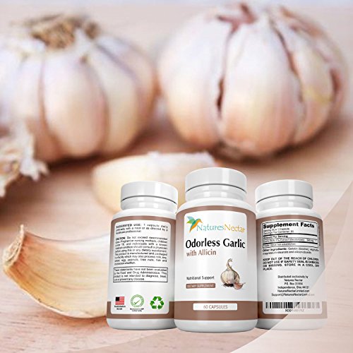 -. Feature : • HEART-HEALTHY BENEFITS- The benefits of garlic have been widely known for centuries, and modern technology has now made it possible to harness the most useful components to give us maximum health potential. Today with Natures Nectar's Odorless Garlic with Allicin Supplement, you can begin to promote healthy blood pressure levels and overall heart health. / • THE ALLICIN DIFFERENCE- Allicin is the critical health component in garlic (beneficial to the immune system and circulatory system) that is released from a freshly crushed clove. Our manufacturing process captures the Allicin so it is not lost in processing. Most supplements on the market do not contain Allicin at all / • MORE CONVENIENT THAN A CLOVE- For some of us, eating garlic daily is not ideal. With our Odorless Garlic with Allicin, you'll get the amazing health benefits of garlic's Allicin without the hassle, taste, and odor of eating a clove. The enteric coating on the capsules protects the garlic from being broken down in the stomach before entering the small intestine, where it is most effective. / • IMMUNITY-BOOSTING ANTIOXIDANT- Support your immune system! Garlic contains antioxidants that protect against cell damage and may boost immune cell function, which is especially important during seasons when our immune systems are most vulnerable. Additionally, oxidative damage from free radicals contributes to the aging process, and garlic protects against this as well. / • OUR 100% MONEY-BACK GUARANTEE - As with all of our products, we offer a 60-DAY 100% Money Back Guarantee - return even the empty bottles! We are so confident that you will love our Odorless Garlic with Allicin that we'll refund every penny if you don't like it. Simply contact Natures Nectar directly for a full refund. What do you have to lose?