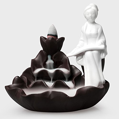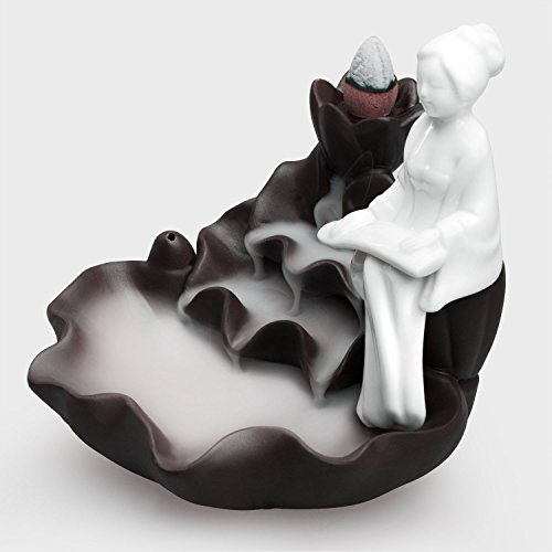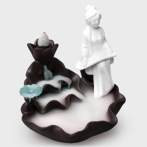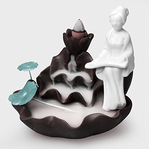 Woobud Incense Burner Backflow Cones Sticks Holder Porcelain Maid Lotus Pond Censer Home Decoration Handicraft Gifts with 10 Cones