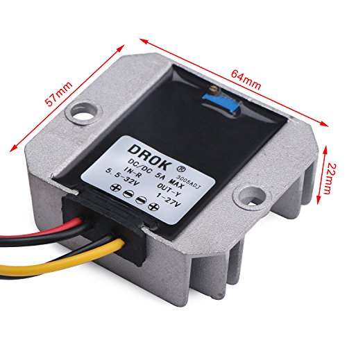 - DC Buck converter: Input of 5.5 to 32V DC and output of 1 to 27V DC, such as step down 12V to 5V DC converter, 24V to 3.7V/4.2V/5V/6V/9V/12V DC voltage drop, convert 18V solar panel output to 12 Volt input for a pond air pump.