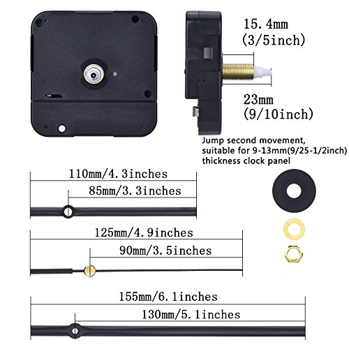 - Jump second movement, suitable for 9 - 13 mm (9/ 25 - 1/ 2 inches) thickness clock panel; Total shaft length: 23 mm (9/ 10 inches), thread length: 15.4 mm (3/ 5 inches)