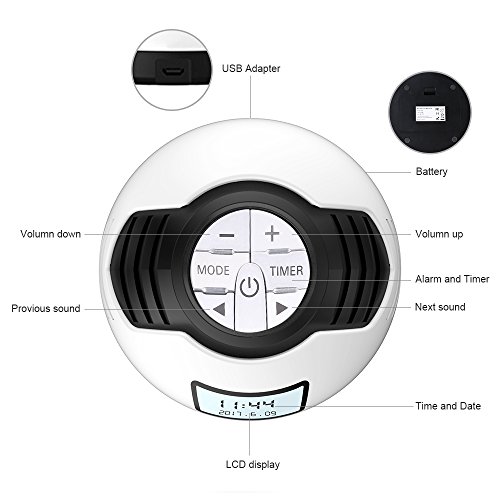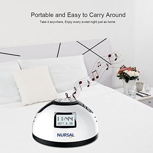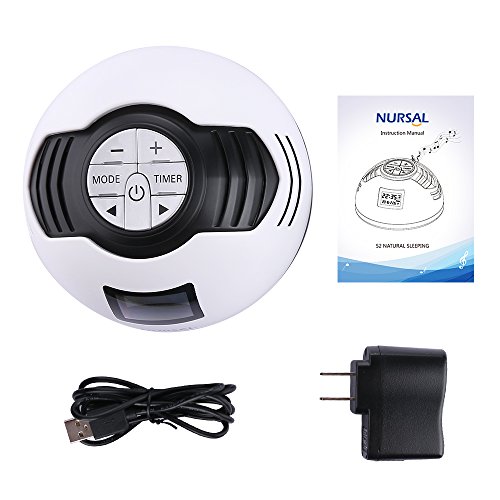 -. Feature : 8 NATURAL SOOTHING SOUNDS: With 8 soothing sounds to choose from, you will find the perfect one to give you a soothing night's sleep. Sounds include; rain, bird, brook, ocean, white noise, thunderstorm and two lullabies. / AUTO-OFF SLEEP FUNCTION: The auto-off timer can be set to 5, 15 or 30 minutes to conserve energy. If you don't set the timer, it will play on continuously until the power runs out. It's a good option to set this if it's being run on batteries. / ALARM FUNCTION: The NURSAL white noise machine can also be used as an alarm. Press and hold "timer" to active the alarm, you can set the desired alarm time with the "+"/ "-" button. / GREAT FOR TRAVEL: It's small and lightweight and easily fits into a bag or suitcase. It will become your perfect travel companion that creates a familiar sleep environment when you travel on business. / FOR A PERFECT NIGHT'S SLEEP: This NURSAL natural sleeping sound machine can improve sleep relaxation and enrich your concentration. Our white noise sleep machine is perfect for a baby's room, nursery, the home and office or any other environment that is in need of some peace and quiet.