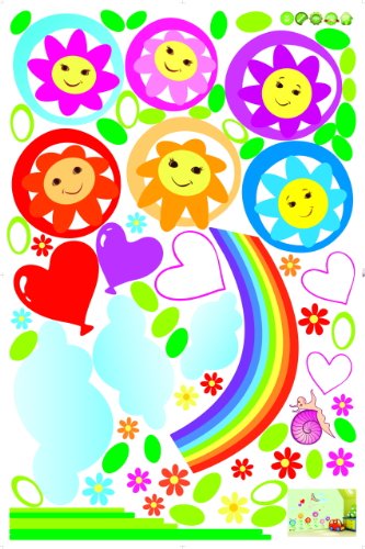 -. Feature : Includes flowers, hearts, snail and rainbow / Applies to any smooth surface / Removable and reusable with no sticky residue / Dimension of product sheet: 23Wx35L
