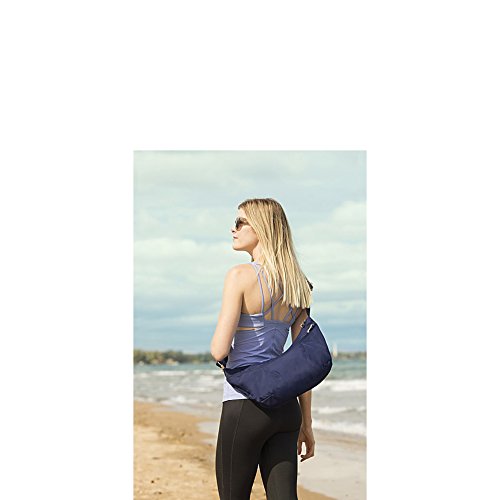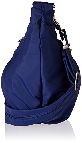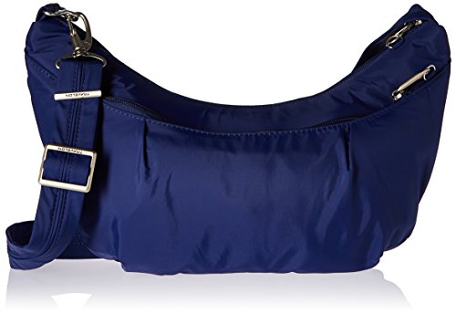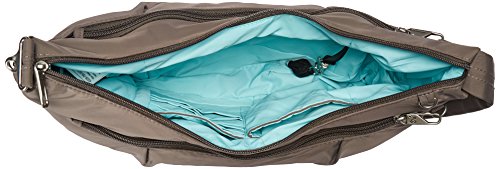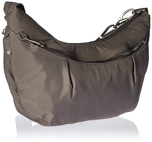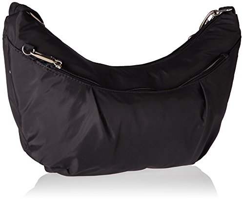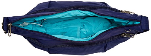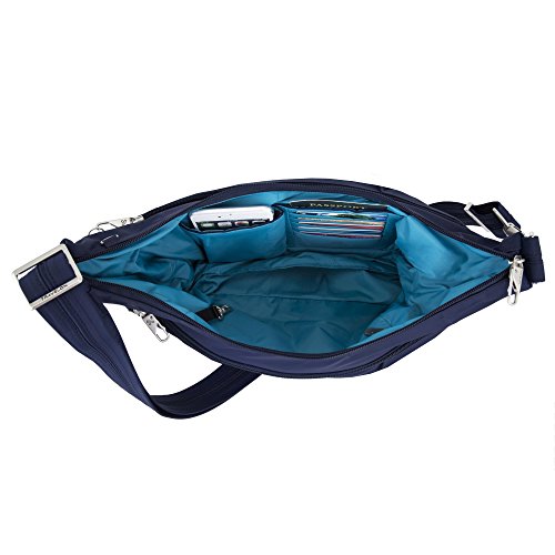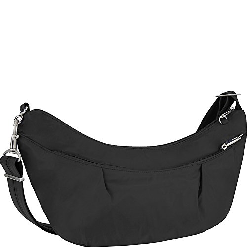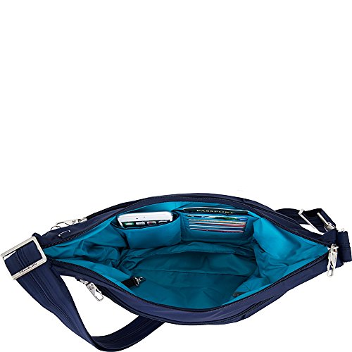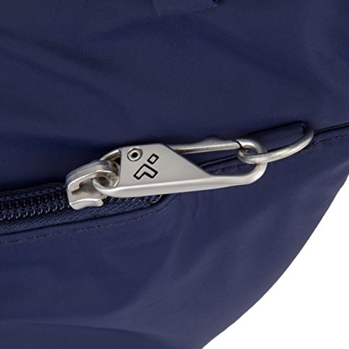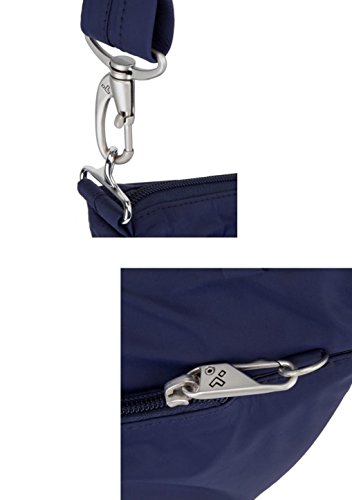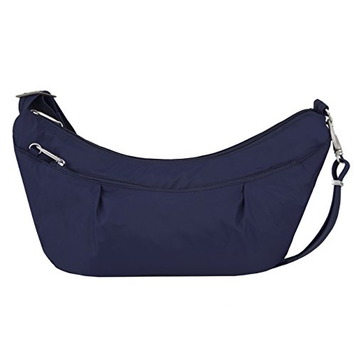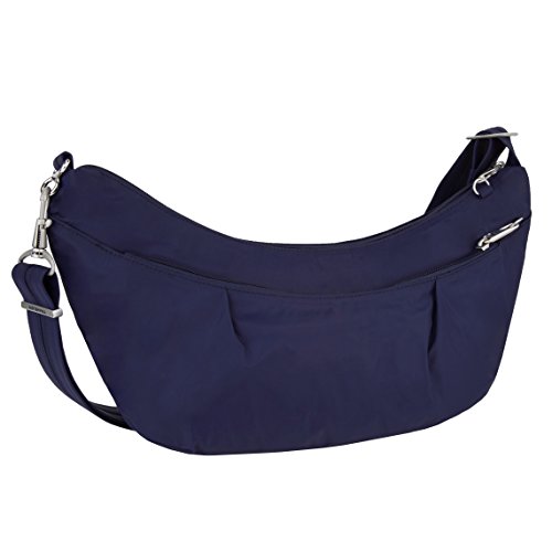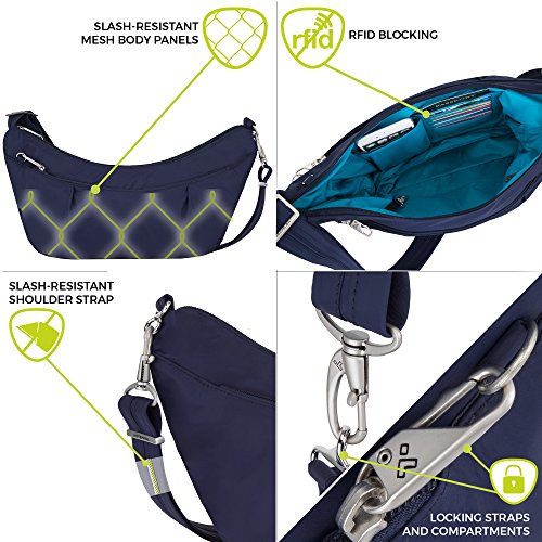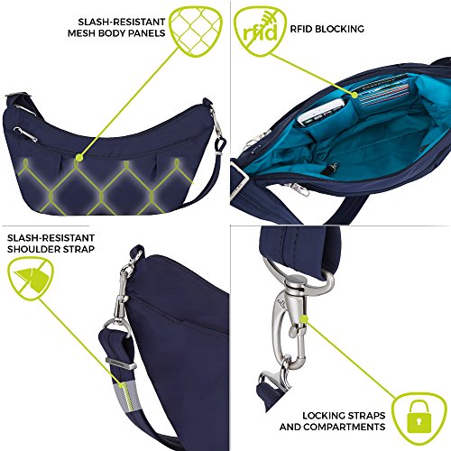 Studio : Travelon Publisher : Travelon Binding : Apparel Product Description This bag is stylish and secure. It has a hidden side zip pocket, locking main compartment and locking front and rear zip pockets for security. The slash-resistant adjustable straps allows you to adjust the bag snuggly against your body. The carabineer allows the bag to be secured to a post or chair to prevent a grab and go. With the tethered key clip with LED light you will be able to locate your items quickly and easily. The RFID blocking technology prevents unauthorized access to your personal information. 0