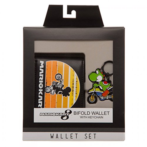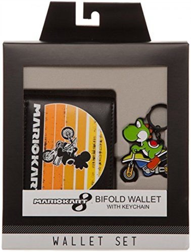 Binding : Apparel Product Description Nintendo Mario Kart Yoshi PU Faux Leather Bi-Fold Wallet Metal Key Chain Gift Box Set. Boxed Set features One Bifold wallet with three horizontal two vertical card pockets, One full size currency compartment one transparent ID window. Plus one metal keychain. 0