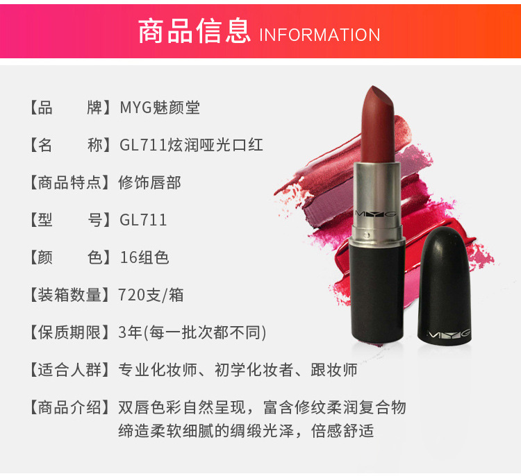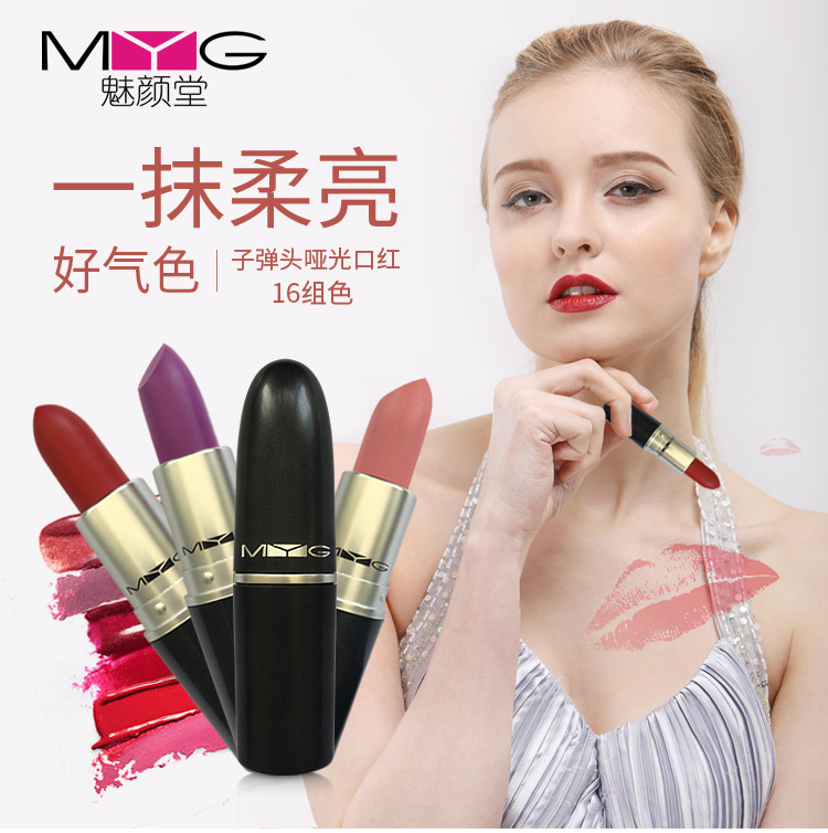 2017年MYG推出的新款哑光口红,价格实惠,质量上档次,且用经典的黑色圆管包装,流线型的子弹头型状,很好吻合手势。16组颜色包含了时下流行的色彩元素:南瓜色、姨妈色、大地色、豆沙色,玫红色。。。在抹之前,搭配润唇膏使用,颜色更立体出色,锁住唇色的同时,也锁住的你的魅力无限!