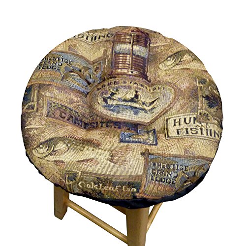 Studio : Barnett Publisher : Barnett Binding : Kitchen Product Description We're confident this is the most comfortable, longest lasting barstool cushion you will ever buy. Our sturdy drawstring yoke will keep the cushion in place on the stool more securely than an elastic yoke and will last longer than non-slip grippers. We select superior quality designer fabric -in this case, a tapestry celebrating outdoors lake fishing and camping with vintage camp labels on the top face, with a solid color fabric yoke. The comfort of latex fill rivals more expensive therapeutic cushions, plus it's more durable than other foams, more resilient, and won't flatten like polyester fill. Made in the USA in the gracious state of Georgia, our barstool cushions reflect our American values of hospitality and charm. (Cushioned Barstool Cover Only - stool not included. This item is made by hand, please allow for slight variations in silhouette and dimensions.) We invite you to browse our storefront for coordinating home decor items, including rocking chair pads, curtains, valances, bed linens, table linens and more. 0