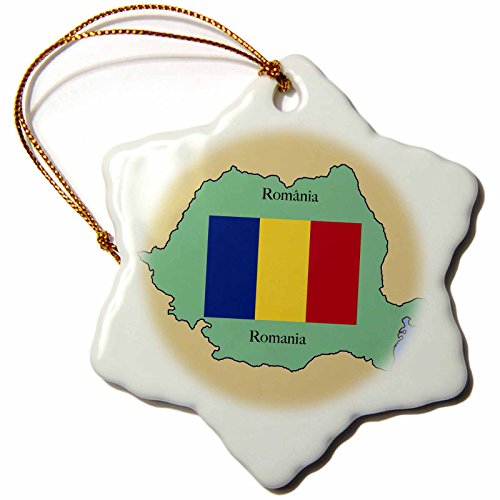 3dRose orn_39222_1 The Map and Flag of Romania with Romania Printed in Both English and Romanian Snowflake Decorative Hanging Ornament, Porcelain, 3-Inch