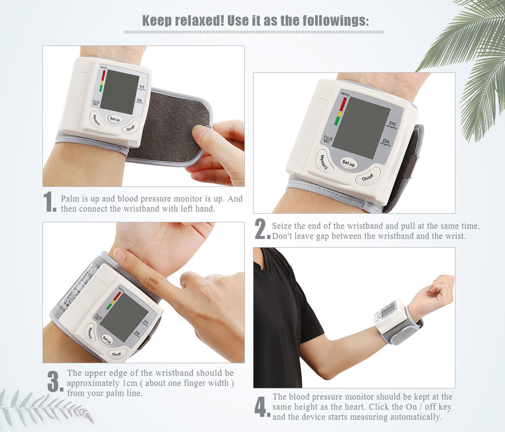 Healthu0026nbsp;Careu0026nbsp;Wristu0026nbsp;Portableu0026nbsp;Digitalu0026nbsp;Automaticu0026nbsp;Bloodu0026nbsp;Pressureu0026nbsp;Monitoru0026nbsp;Householdu0026nbsp;TypeProtectu0026nbsp;youru0026nbsp;lifeu0026nbsp;now!Dou0026nbsp;youu0026nbsp;wantu0026nbsp;tou0026nbsp;detectu0026nbsp;highu0026nbsp;bloodu0026nbsp;pressureu0026nbsp;beforeu0026nbsp;itu0026nbsp;becomesu0026nbsp;au0026nbsp;seriousu0026nbsp;problem?Theu0026nbsp;wristu0026nbsp;bloodu0026nbsp;pressureu0026nbsp;monitoru0026nbsp;isu0026nbsp;compactu0026nbsp;andu0026nbsp;effortlesslyu0026nbsp;portableu0026nbsp;andu0026nbsp;incrediblyu0026nbsp;easyu0026nbsp;tou0026nbsp;use.Quicklyu0026nbsp;andu0026nbsp;quietlyu0026nbsp;measuresu0026nbsp;bloodu0026nbsp;pressureu0026nbsp;andu0026nbsp;heartu0026nbsp;rateu0026nbsp;foru0026nbsp;accurateu0026nbsp;resultsu0026nbsp;andu0026nbsp;displaysu0026nbsp;itu0026nbsp;onu0026nbsp;theu0026nbsp;largeu0026nbsp;digitalu0026nbsp;panel.Thisu0026nbsp;lightweightu0026nbsp;wristu0026nbsp;bloodu0026nbsp;pressureu0026nbsp;monitoru0026nbsp;makesu0026nbsp;itu0026nbsp;easyu0026nbsp;tou0026nbsp;checku0026nbsp;youru0026nbsp;bloodu0026nbsp;pressureu0026nbsp;anywhere,u0026nbsp;fromu0026nbsp;theu0026nbsp;officeu0026nbsp;tou0026nbsp;onu0026nbsp;theu0026nbsp;go.Description:Quicku0026nbsp;andu0026nbsp;accurateu0026nbsp;measurementu0026nbsp;ofu0026nbsp;bloodu0026nbsp;pressureu0026nbsp;andu0026nbsp;pulse.Warningu0026nbsp;heartu0026nbsp;blinker,u0026nbsp;showsu0026nbsp;thatu0026nbsp;theu0026nbsp;monitoru0026nbsp;isu0026nbsp;takingu0026nbsp;measurement.Wristu0026nbsp;typeu0026nbsp;modelu0026nbsp;withu0026nbsp;simpleu0026nbsp;operationu0026nbsp;ofu0026nbsp;justu0026nbsp;1u0026nbsp;buttonu0026nbsp;push.Guideu0026nbsp;standardsu0026nbsp;foru0026nbsp;assessmentu0026nbsp;ofu0026nbsp;highu0026nbsp;bloodu0026nbsp;pressure.Idealu0026nbsp;foru0026nbsp;theu0026nbsp;dailyu0026nbsp;monitoringu0026nbsp;ofu0026nbsp;bloodu0026nbsp;pressure.Automaticu0026nbsp;determinesu0026nbsp;idealu0026nbsp;cuffu0026nbsp;inflation.Averageu0026nbsp;valueu0026nbsp;foru0026nbsp;lastu0026nbsp;threeu0026nbsp;records.Selectableu0026nbsp;betweenu0026nbsp;mmhgu0026nbsp;andu0026nbsp;kpa.Irregularu0026nbsp;heartu0026nbsp;beatingu0026nbsp;signal.Highu0026nbsp;andu0026nbsp;lowu0026nbsp;pulseu0026nbsp;rateu0026nbsp;indicators.Largeu0026nbsp;andu0026nbsp;clearu0026nbsp;LCD,u0026nbsp;easyu0026nbsp;tou0026nbsp;read.Features:Type:u0026nbsp;Wristu0026nbsp;Bloodu0026nbsp;Pressureu0026nbsp;Monitor.Wristu0026nbsp;circumference:u0026nbsp;135u0026nbsp;~u0026nbsp;195u0026nbsp;mm.Measurementu0026nbsp;Range:Pressure:u0026nbsp;20u0026nbsp;~u0026nbsp;280u0026nbsp;mmHg.Pulseu0026nbsp;rate:u0026nbsp;40u0026nbsp;~u0026nbsp;165u0026nbsp;beatsu0026nbsp;/u0026nbsp;min.Pressure:u0026nbsp;withinu0026nbsp;3u0026nbsp;mmHg.Pulseu0026nbsp;rate:u0026nbsp;withinu0026nbsp;5u0026nbsp;percentu0026nbsp;ofu0026nbsp;reading.Poweru0026nbsp;supply:u0026nbsp;2u0026nbsp;xu0026nbsp;AAAu0026nbsp;alkalineu0026nbsp;batteriesu0026nbsp;(notu0026nbsp;included).Memoryu0026nbsp;capacity:u0026nbsp;90u0026nbsp;groupsu0026nbsp;ofu0026nbsp;datau0026nbsp;