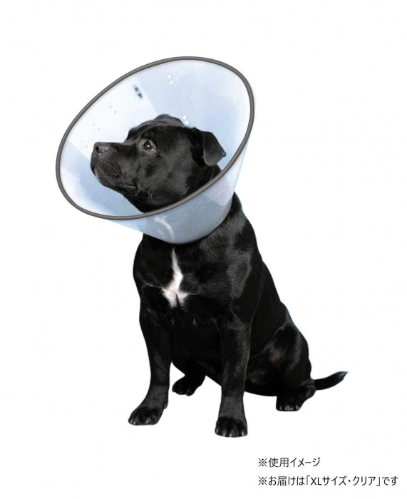 ケガや手術後に傷口をなめたり、ひっかいて悪化させないように装着します。全体的に透明感があり視界良好。外側のリムが平衡感覚、視界バランスも保ちます。