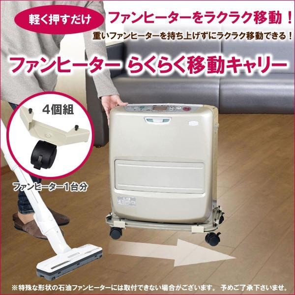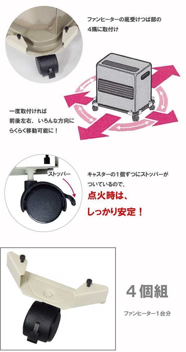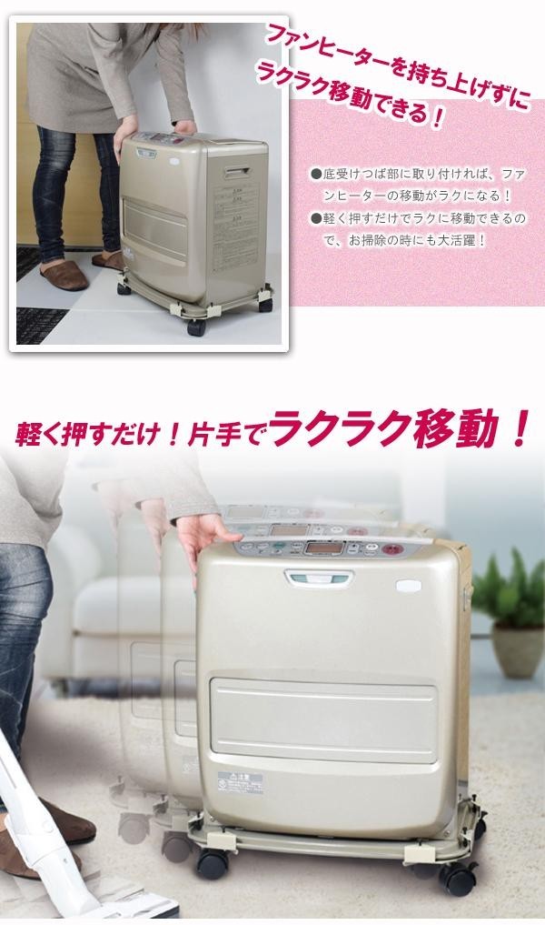 | 底受けつば部に取り付ければ、石油ファンヒーターの移動が楽になる!軽く押すだけでらくらく移動できるので、お掃除の時も大活躍します。キャスター1個ずつにストッパーが付いているので、固定でき、点火時はしっかり安定します。 |