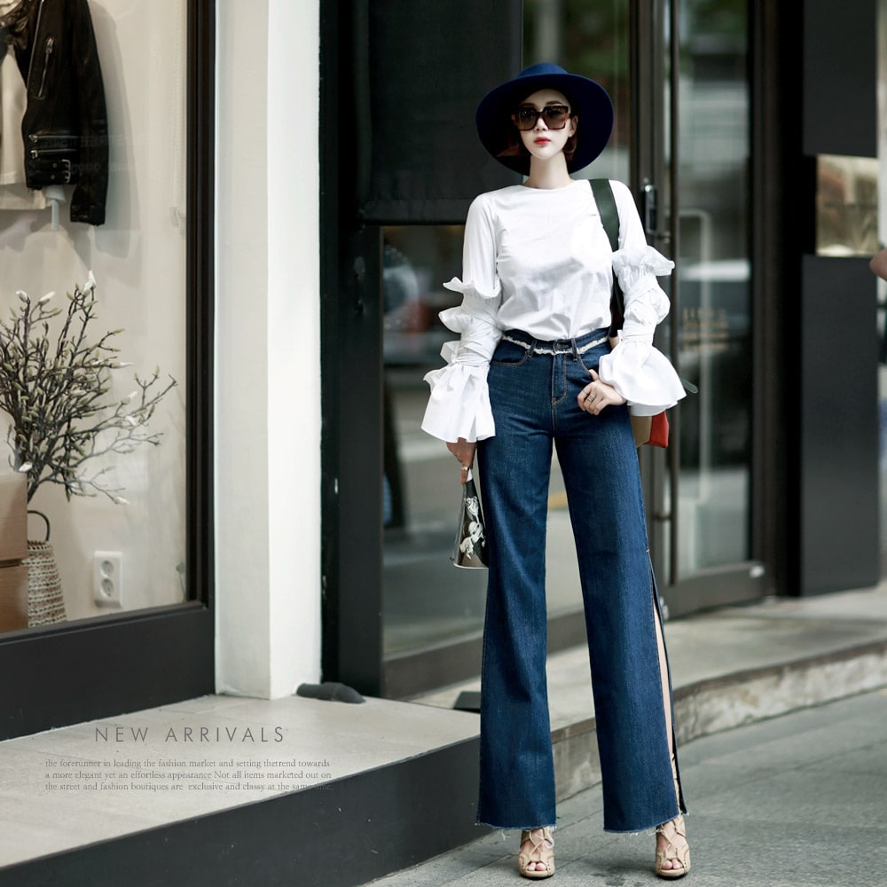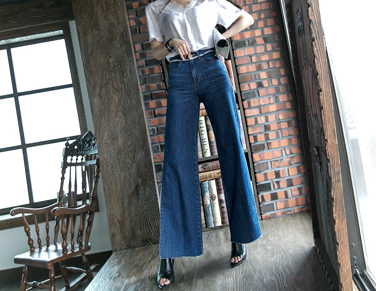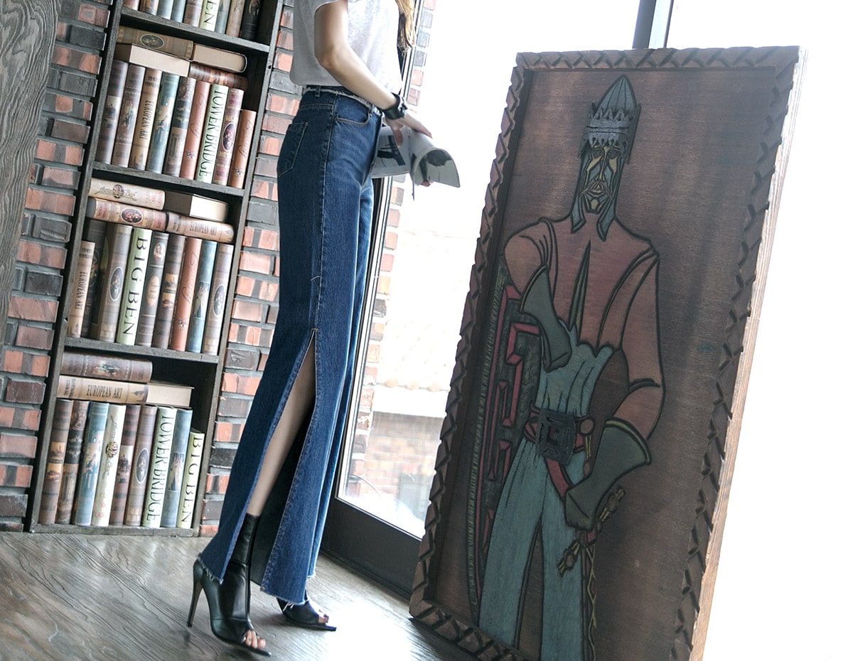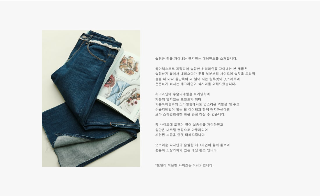 PJ277 프린지 웨이스트 딥 슬릿 데님 팬츠*자체제작* Blue