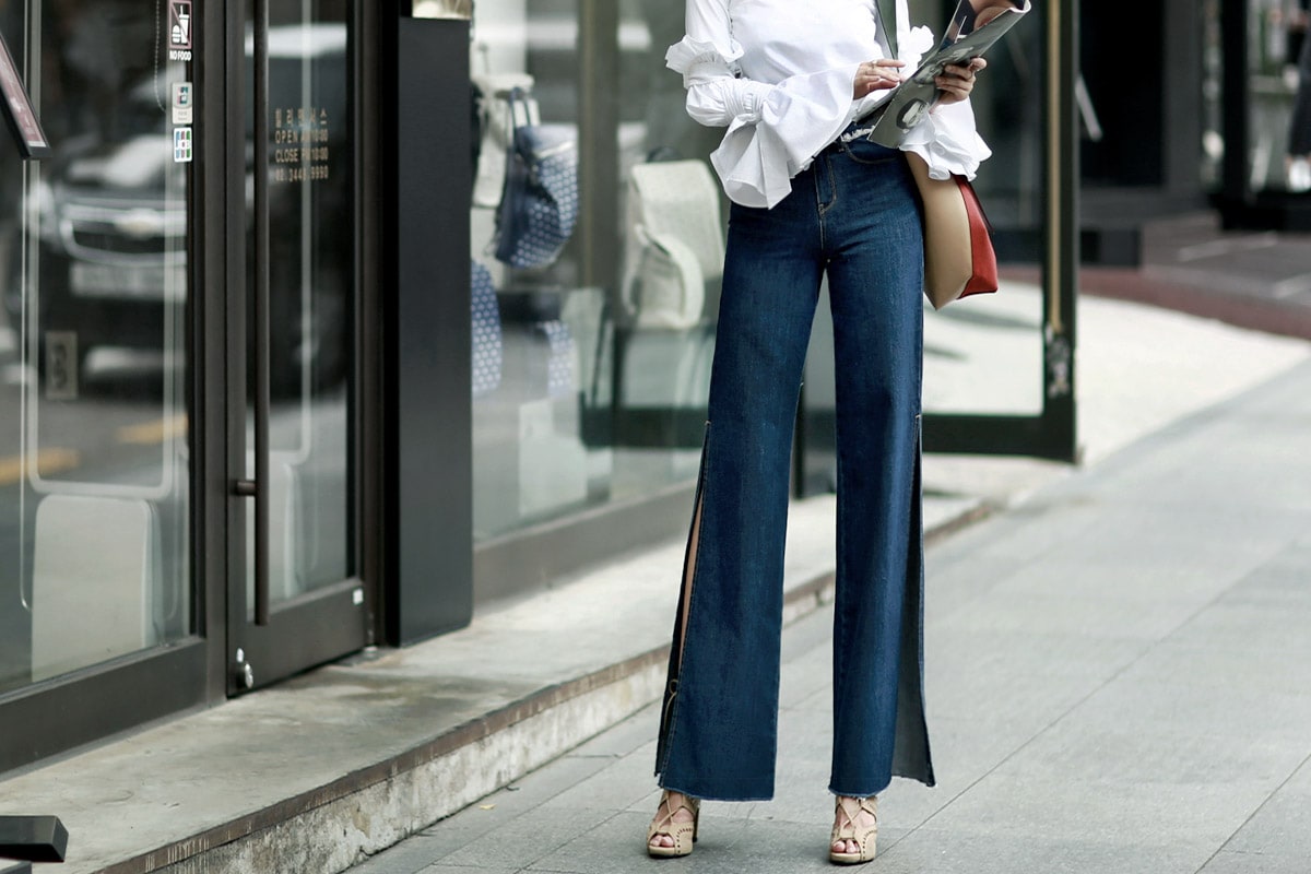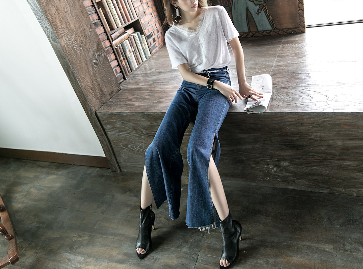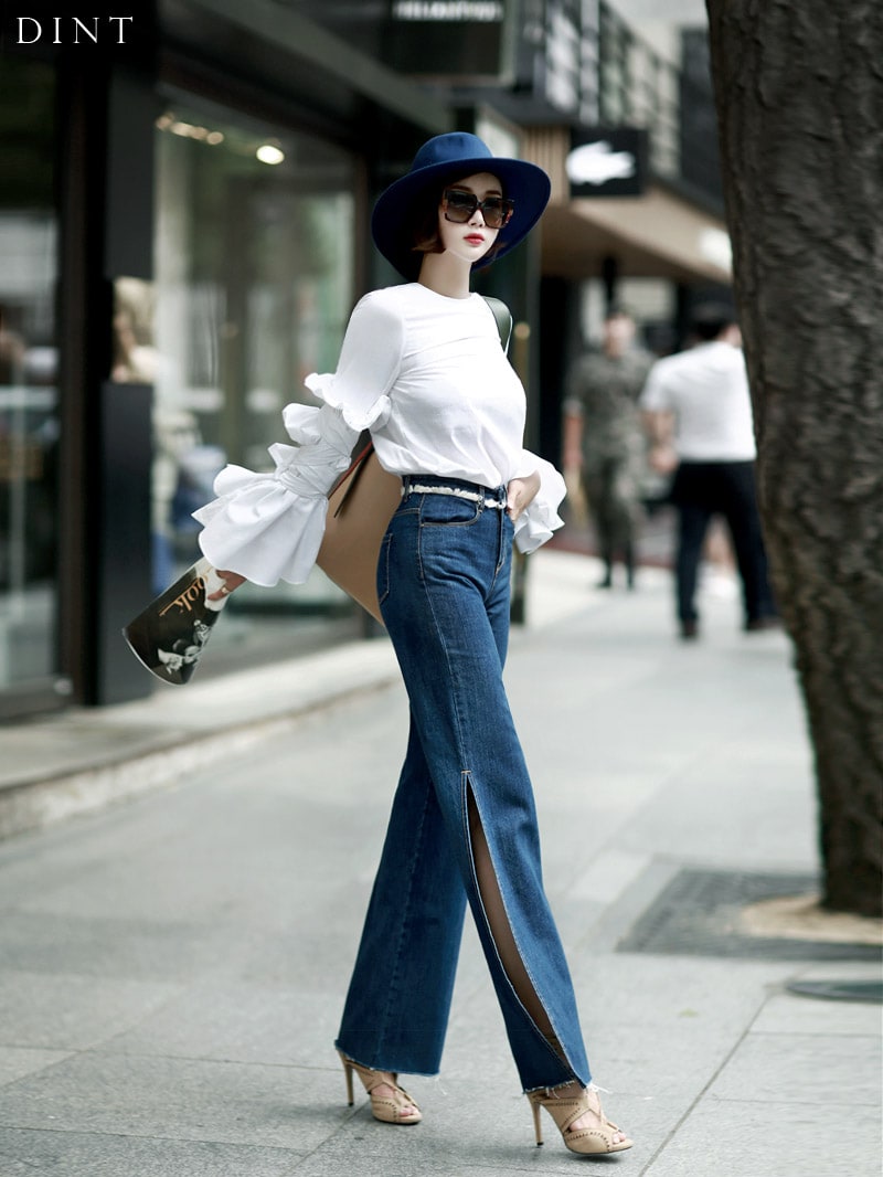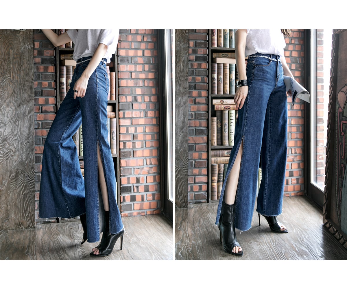 PJ277 프린지 웨이스트 딥 슬릿 데님 팬츠 Blue