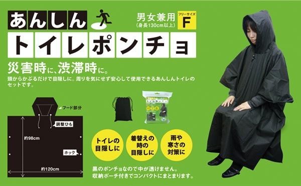 | 頭からかぶるだけでトイレや着替えの目隠しに。黒のポンチョなので中が透けません。持ち運びに便利な収納ポーチ付きです。 |