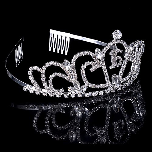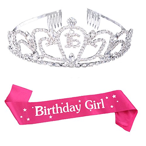 Maticr Sweet Sixteen 16 Crystal Tiara Crown and Sash 16th Birthday Girl Party Accessories Set (Silver)