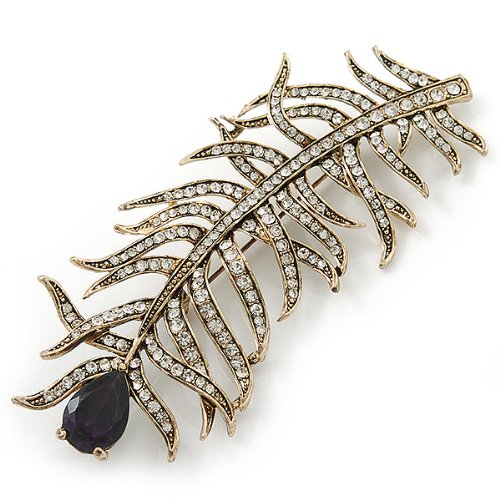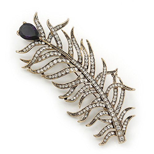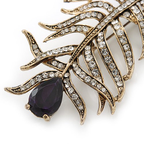 Escape to a world where fantasy reigns. This whimsical design displays a sparkling array of colourful crystals that add a bold confidence to your favourite looks. Featuring a large peacock feather design, crafted in antique gold metal and encrusted with a teardrop cut deep purple Cz and Swarovski crystals in hues of clear. It measures about 90mm L x 35m W, and secures with a flag pin and revolver clasp. Fantastic gift idea - Christmas, birthday, anniversary, mothers day, etc. Easily fastens to any bag, hat, coat or jacket.Feature
