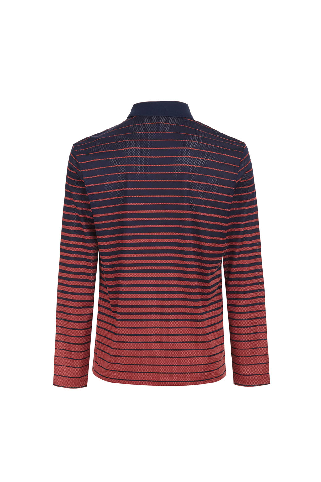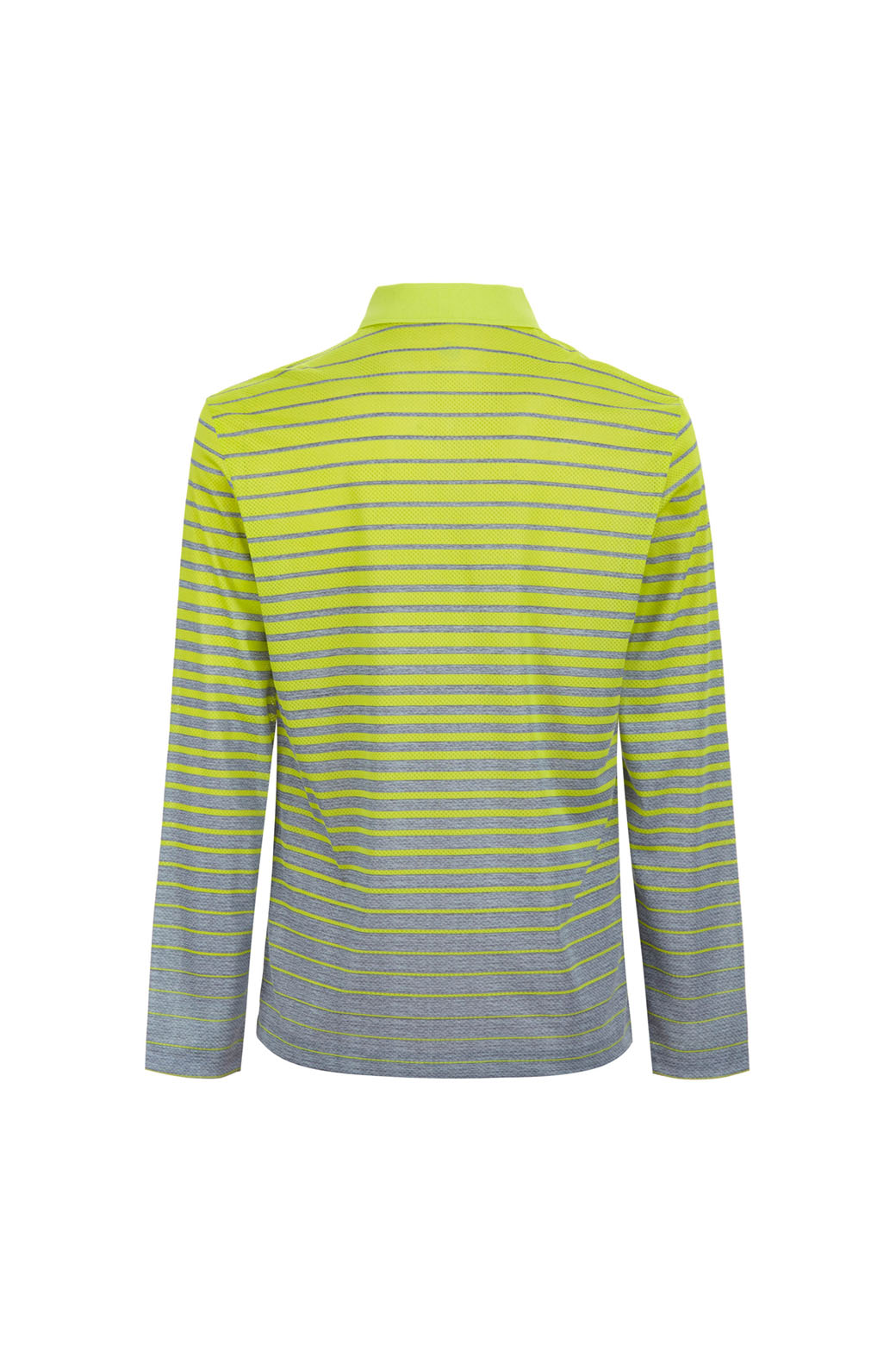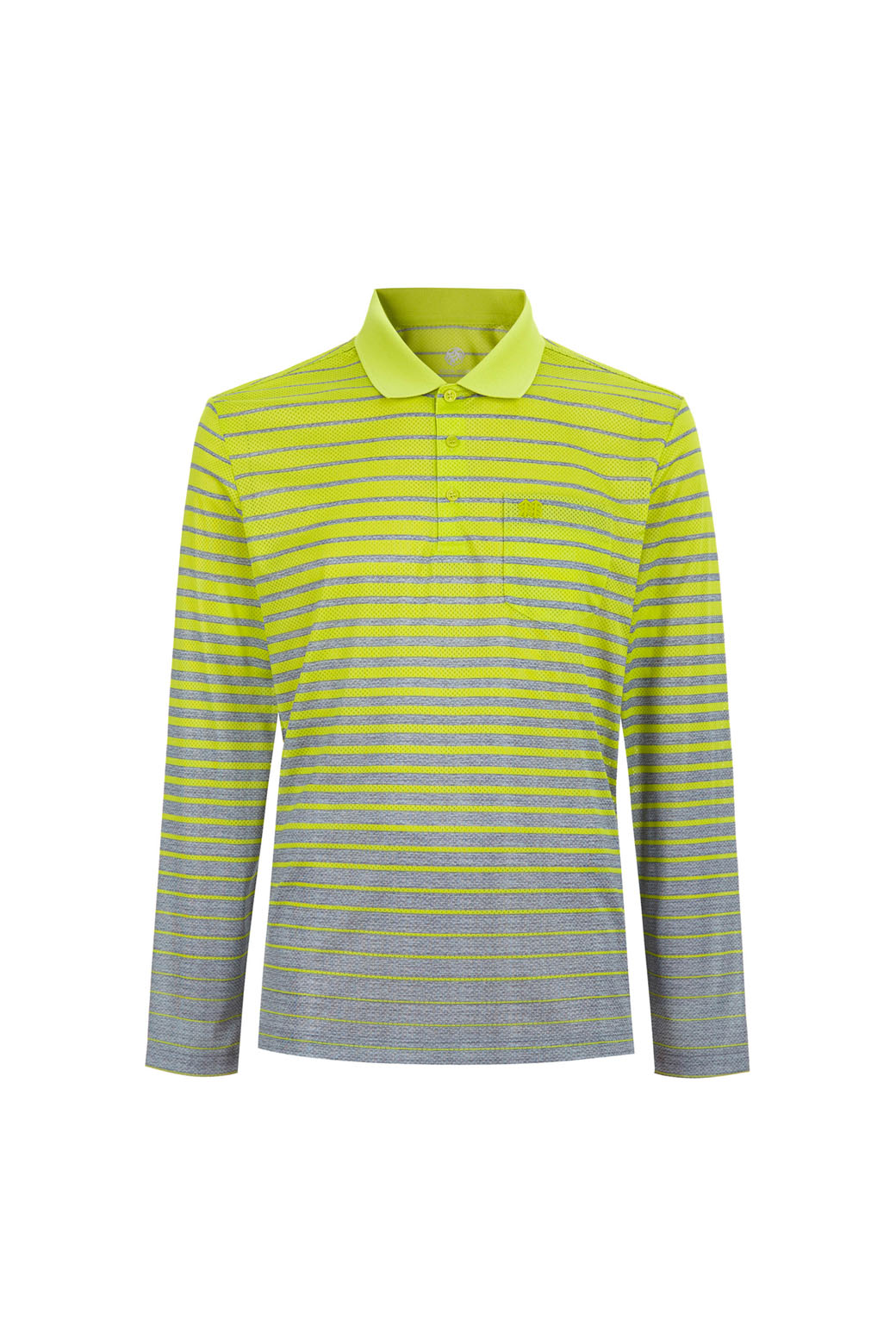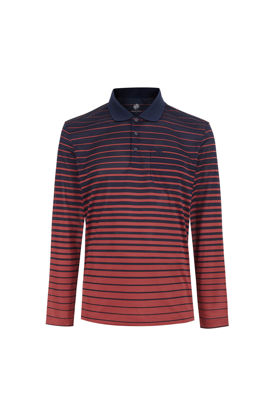- 그라데이션 스트라이프 패턴을 적용한 남성 긴팔티셔츠.- 립조직 카라 디자인과 3버튼 여밈으로 베이직한 외관.- 부드러운 폴리 레이온 혼방 소재로 가벼우며 부분 펀칭 메쉬를 적용하여 더욱 쾌적한 착용감.- 가슴 부분 러버 상록수 패치를 적용한 디테일 포인트.